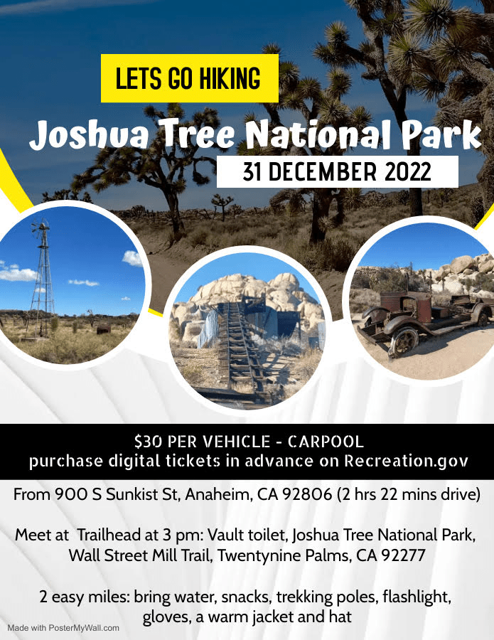 “Cross-fit” Outdoor group Hiking this Sabbath Afternoon (weather permitting) This Sabbath afternoon, a group will be meeting at the “Wall Street Mill” trailhead in Joshua Tree National Park at 3:00 p.m., for an afternoon hike and (hopefully) sunset & stargazing time afterward. Trailhead is about 20 minutes past the western park entrance. Entry per vehicle is $30 per car, so carpooling is encouraged. Entry fee can also be paid ahead of time online for those who prefer it. The hike itself will be 2 easy miles: you are recommended to bring water, snaks, trekking poles, flashlight, gloves, jacket and hat. (see attached graphic)