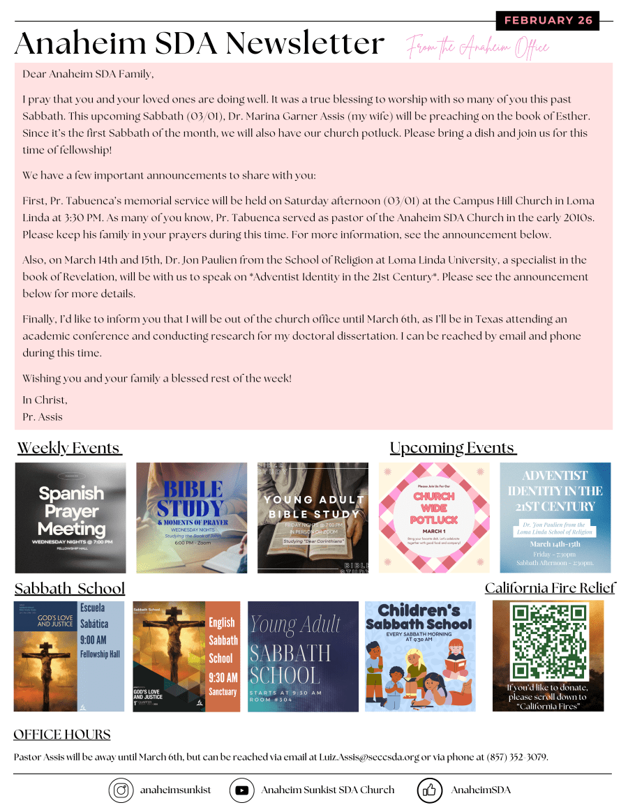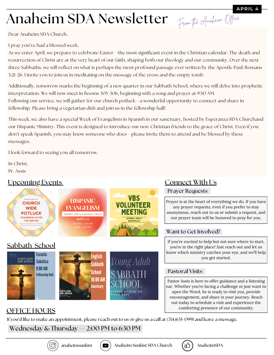 Anaheim SDA Newsletter — 4/9 đŸĒģ